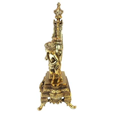 With more than enough character to hold its own amongst your other antiques, a pair of Pan figures flank this period work of decorative art. Amidst swagged garlands of flowers and heraldic crests, this truly ornate clock becomes period decor. Our Rococo work is cast in designer resin and finished in antiqued faux gold. The quality quartz clock boasts Roman numerals with sweep second hand and makes a dramatic statement in any room of your home! Do not leave lit candles unattended. Candles not included. Clock: 12″Wx8½”Dx24″H. 18 lbs.