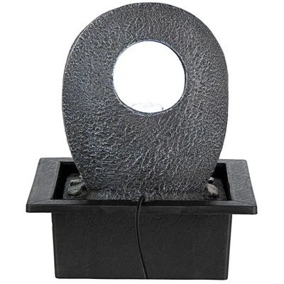 Searching for a peaceful, relaxed, serene oasis amid a chaotic world? This petite Design Toscano tabletop fountain is a zen water feature that employs organic elements in a modern style. The eye naturally follows as sparkling water quietly moves through the spiral circle design down toward the rocks where it peacefully bubbles. Cast in quality designer resin and hand-finished to replicate natural stone, this lightweight, portable, and easy-to-set-up fountain also features a UL-listed indoor/outdoor pump and hidden, underwater LED lights that emit a soft glow. It’s ready the moment you add water and plug it in! 8½”Wx7″Dx10″H. 5 lbs.