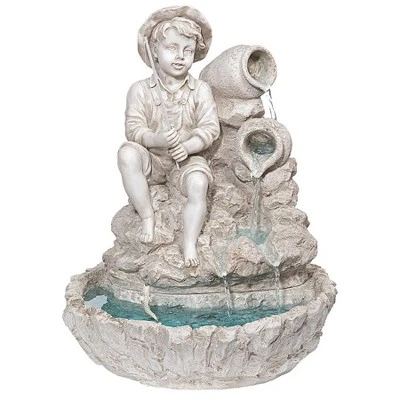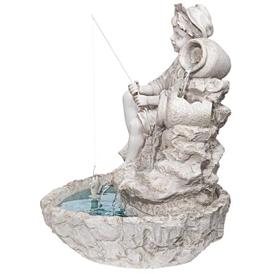 Welcome this little fisherman fountain to help celebrate life’s simpler days with the sounds of soothing water music! Endearingly sculpted from the boy’s straw hat to the small fish swimming in the pool basin below, this charmingly functional work of decorative art is cast in quality designer resin with a rustic, antique stonework finish. Our classic, Design Toscano-exclusive sculptural fountain is sized to fit most anywhere and creates both a nostalgic atmosphere and a truly calming resting place. Features an integrated, UL-listed, indoor/outdoor pump. Simple assembly required. 13″dia.x17″H. 19 lbs.