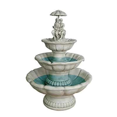 The European tradition of formal fountains lives on in this sophisticated, garden fountain whose cascading tiers lend soothing water music to any garden. Water cascades from the umbrella at the crown and gently flows past the romantic couple creating dramatic waves of sound. Enjoy the soft shimmer and romantic tone of the splashing spray as this fountain takes its place as a magnificent centerpiece of your garden. Hand-cast in quality designer resin and finished with pride exclusively for Design Toscano, the fountain is engineered for proper water flow with a built-in recirculating indoor/outdoor UL-listed pump that uses normal household current. Simple assembly required.