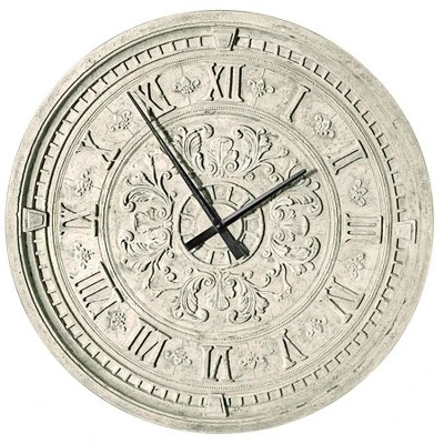 Seemingly hand-carved from a giant sheet of French limestone and boasting Roman numeral detailing, this grand-scale train station clock brings timeless style to your home or garden wall. Featuring a quality quartz movement, the classic lines of this timeless design lend a sense of history to most any decor. Fully functional as well as breathtaking in detail, this art piece is cast in high-quality, fiberglass-reinforced resin. This large-scale, display-quality clock transforms any home bar, entertainment area or recreation room into something truly magnificent! Accepts your AA battery. 33½”dia.x2½”D. 33 lbs.