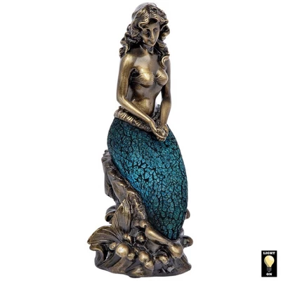 Sparkling like the midday sun off the brilliant ocean, this eye-catching table lamp boasts crackled tempered Tesserae mosaic glass, literally composed of thousands of individually placed, hand-grouted glass pieces that reflect an inner light. This beautiful siren of the sea casts a sensual spell as a collectible fantasy figurine artistically sculpted and cast in quality designer resin for Basil Street Gallery. This functional work of decorative art is illuminated by your 25-watt, type B bulb via switch on cord.