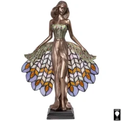Reminiscent of the famed fan dancers of the European stage, this magnificent Art Nouveau beauty unfolds her peacock feather mosaic skirt created of over 125 individually hand-cut pieces of shimmering, copper-foiled stained glass and 8 cabochons, to cast a soft glow in home or gallery. Cast in quality designer resin with a color washed bronze finish and sparkling, faux jeweled accents, the priestess will add radiance to any room. Our Toscano exclusive accepts your single, 25-watt candle bulb and is illuminated by a switch on cord. 10½”Wx7″Dx16″H. 5 lbs.