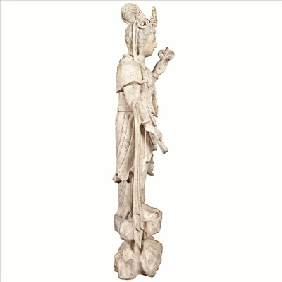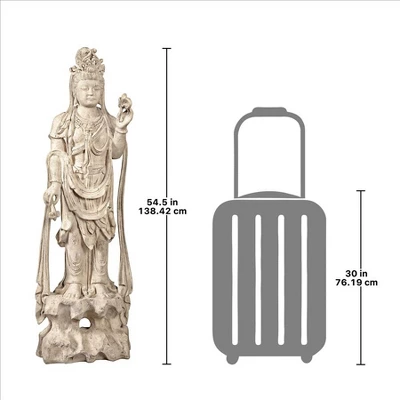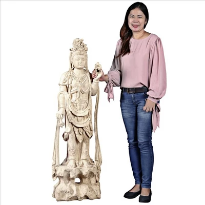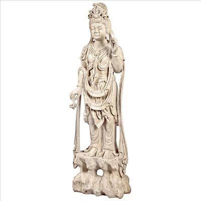 Found in most temples under various names, the elegantly merciful Guan-Yin is so prolific as to also find a home in most art museums worldwide. Sculpted here with symbolically posed hands, prayer beads and a serene smile, this garden statue atop a pedestal throne is created exclusively for Design Toscano. Cast in quality, fiberglass-reinforced designer resin, this masterpiece boasts a limestone finish, for year-round display in home, garden or restaurant. Our exclusive statue is perfect in an entryway or an outdoor Zen meditation garden. 17″Wx14″Dx54½”H. 41 lbs.