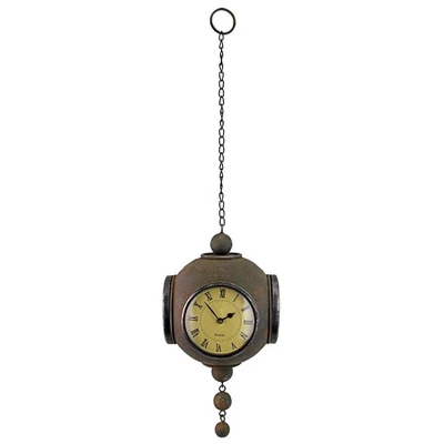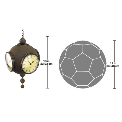 Industrial chic adopts an unmistakable retro style in this four-sided, spherical clock that hangs smartly from a metal chain. A stylish addition to home decor that embraces Gothic, Steampunk or Victorian grunge edginess, this weathered-look timepiece is found only at Design Toscano. Boasting discrete Roman numerals, each of the quartz movement clocks accepts your single AA battery. 7″dia.x13″H. (27″ with chain) 2 lbs.